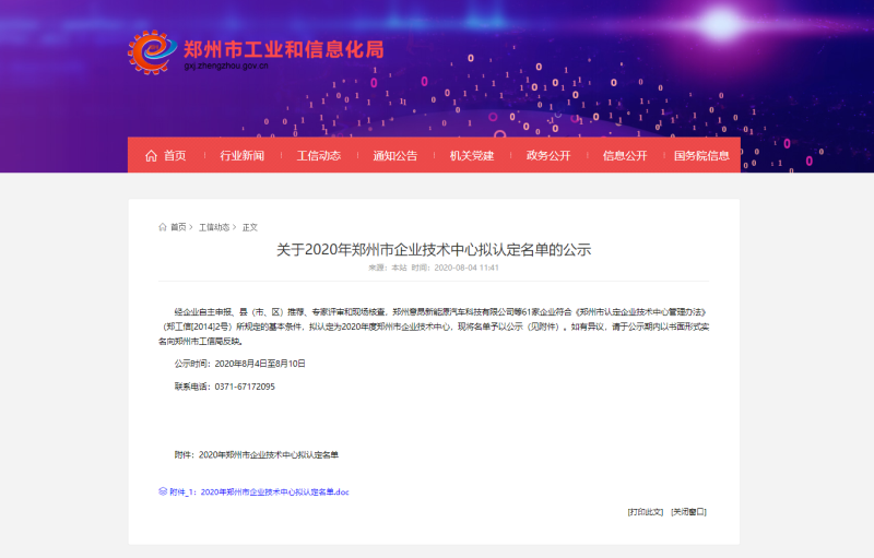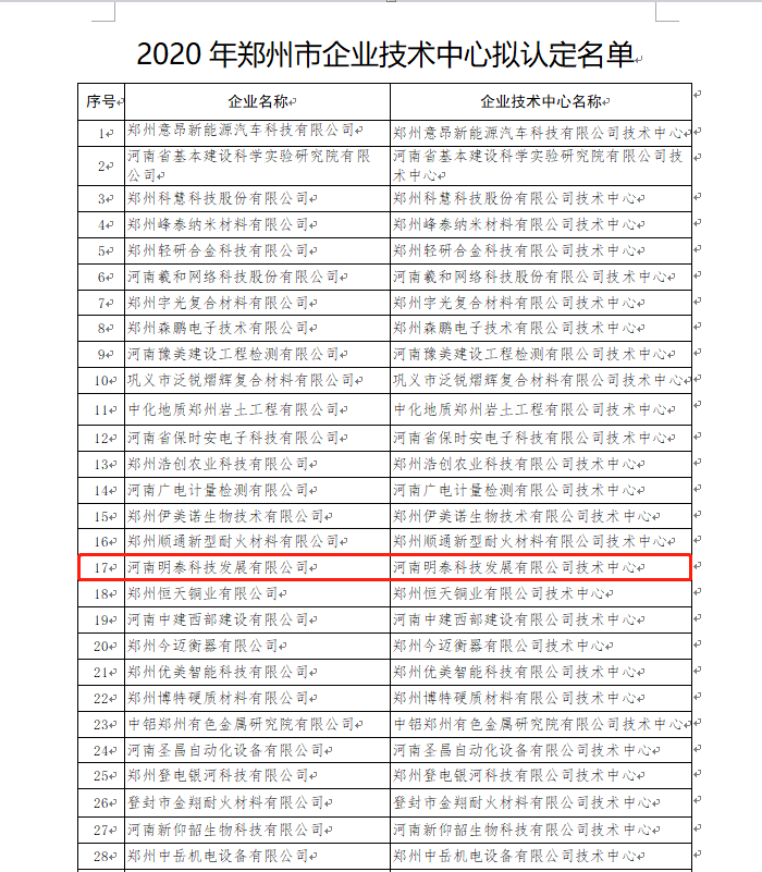 2020年8月4日,經企業自主申報、縣(市、區)推薦、專家評審和現場核查,河南明泰科技發展有限公司等61家企業符合《鄭州市認定企業技術中心管理辦法》(鄭工信[2014]2號)所規定的基本條件,擬認定為2020年度鄭州市企業技術中心,鄭州市工業和信息化局將名單予以公示。